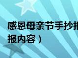 大家好,小乐来为大家解答以下的问题,感恩母亲节手抄报内容文字,感恩母亲节手抄报内容很多人还不知道,现在让我们一起来看看吧!1、母亲 浏览全文>>